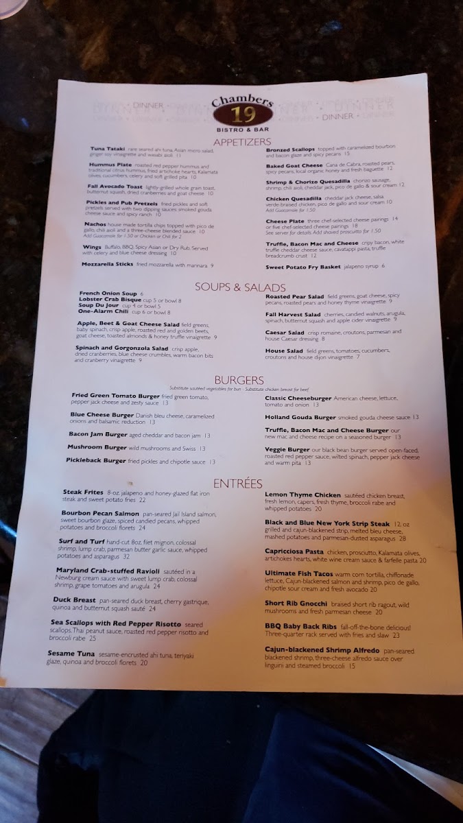 Chambers 19 Bistro & Bar offers a thoughtfully curated menu that blends classic bistro comfort with casual bar favorites. Whether you’re stopping by for a relaxed weekday dinner, meeting friends for happy hour, or enjoying a leisurely weekend meal, the menu provides a range of choices that feel both satisfying and approachable.