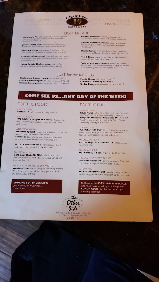 Sides and appetizers offer flexibility, making it easy to customize your meal or share small plates. The drink menu, featuring local beers and creative cocktails, completes the experience, aligning well with the venue’s inviting and relaxed vibe. Whether it’s a quick bite or a full dinner, the menu at Chambers 19 feels thoughtfully designed for everyday enjoyment in a comfortable, friendly setting.